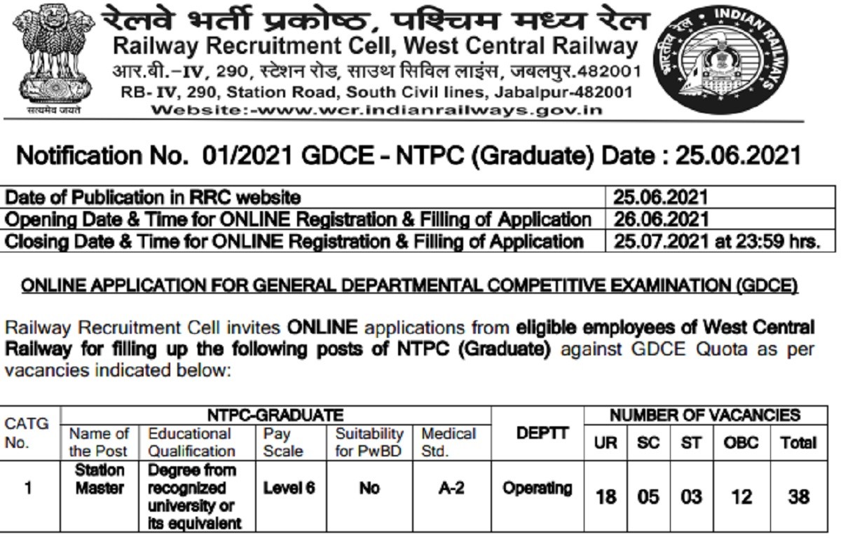 Recruitment 2021: आरआरसी की आधिकारिक वेबसाइट www.wcr.indianrailways.gov.in पर दिए गए